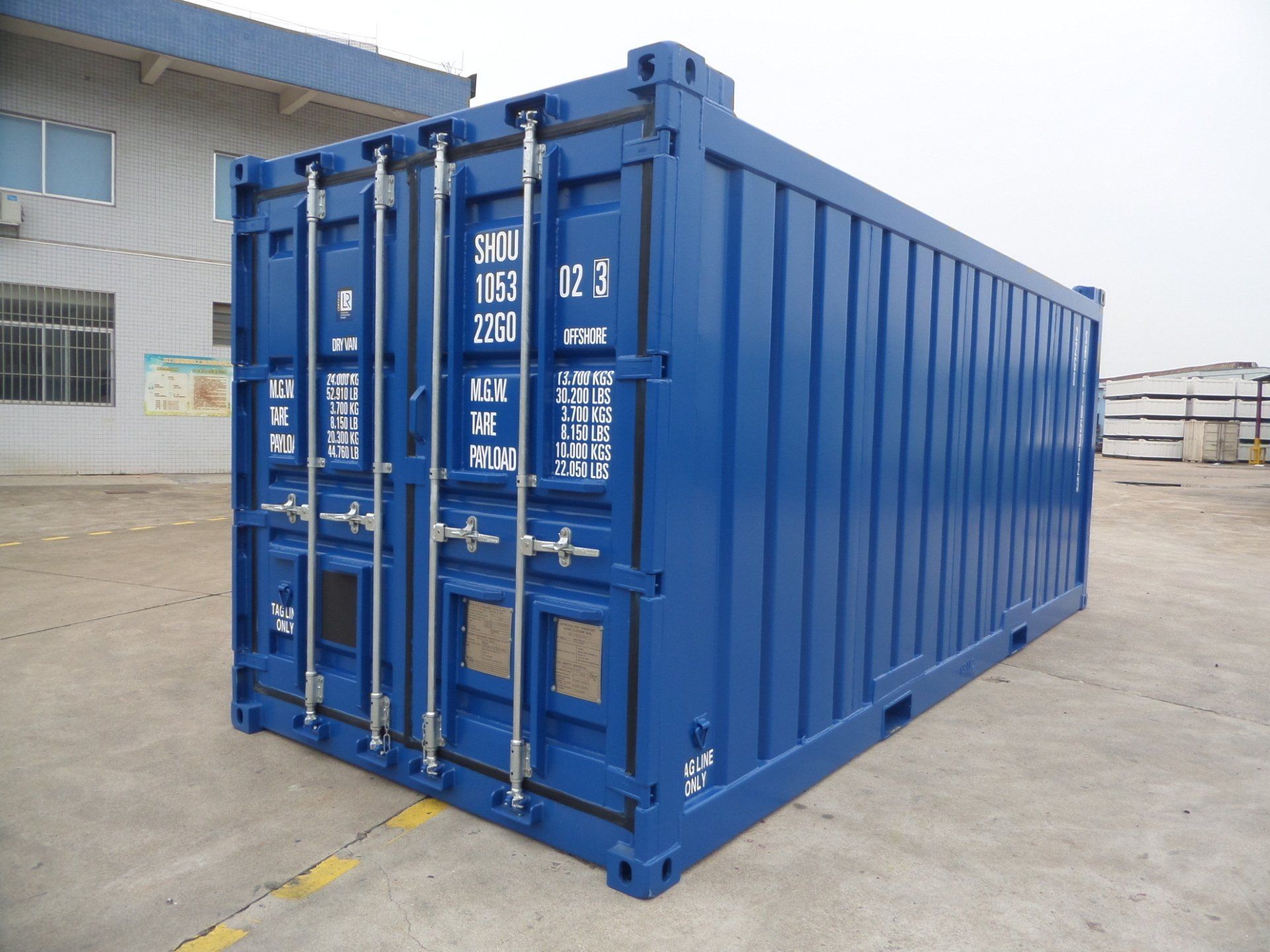 | 20ft Dry Goods (corrugated panel) ISO/CSC | 6 | 6058 x 2438 x 2591 (high) | 20'0" x 8'0" x 8'6" (high) | 3,700 | 8,160 | 10,000 | 22,050 |